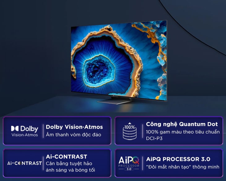 Bộ xử lý AiPQ Processor 3.0 sử dụng AI phân tích nội dung theo thời gian thực, cân chỉnh màu sắc, độ tương phản và độ nét phù hợp từng cảnh, cho hình ảnh luôn sống động, sắc sảo mà vẫn giữ được độ tự nhiên giống như thực tế.